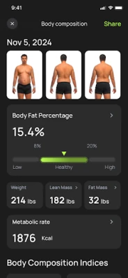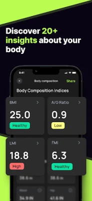 С BodySnap вие получавате иновативен AI скенер за телесна композиция, който разкрива ценната информация, скрита във вашето тяло. Просто направете бърз преглед, а нашата усъвършенствана технология ще анализира и ще ви предостави изчерпателен отчет за вашите метрики. Следете процента на телесните си мазнини, масата на чистата мускулатура и съотношението A/G за по-дълбоки здравни прозрения. Приложението BodySnap също така изчислява вашата базална метаболитна скорост и предоставя детайлни измервания на ръцете, краката, талията, гърдите и други части, превръщайки го в най-добрия ви партньор за проследяване на напредъка във времето.