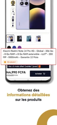 Разширете своя избор с нашия богат каталог, включващ всичко – от най-новите модели телефони и таблети до съвременни телевизори и електроника. Оборудвайте дома си с висококачествени електроуреди, обновете гардероба си с актуална мода за мъже, жени и деца, или открийте уникални продукти „Произведено в Камерун". Предлагаме още елегантни кухненски принадлежности, изискани козметични стоки, решения за соларна енергия и модерни системи за електронна сигурност. За ваше улеснение, можете да прегледате продуктите си и да заплатите удобно при доставка.