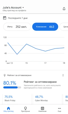 Получавайте ясна представа за ефективността на вашите реклами чрез достъп до детайлни статистики за реализации, импресии и кликвания. Приложението Google Ads ви дава възможност да преглеждате ключови метрики и да оценявате възвръщаемостта на инвестициите си в реално време. Освен това, ще разполагате с персонализиран рейтинг за оптимизация и стратегически препоръки, базирани на задълбочен анализ, които ще ви помогнат да подобрите представянето на кампаниите си и да постигнете по-добри резултати.