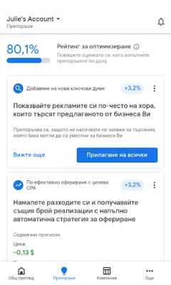 Google Ads е вашето мобилно решение за управление на рекламни кампании в движение. Проследявайте ефективността в реално време, получавайте важни препоръки за оптимизация и предприемайте бързи действия за успех, където и да се намирате.