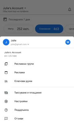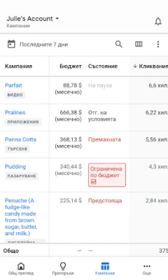 Независимо дали искате да създадете изцяло нови реклами, да редактирате съществуващи или да адаптирате бюджети и оферти, Google Ads предоставя интуитивни инструменти за бързи и ефективни промени. Управлявайте ключови думи и целенасочено стимулирайте продажби, привличайки нови клиенти и потребители онлайн. В случай на въпроси или нужда от съдействие, винаги можете да разчитате на директна връзка със специалист по поддръжката – чрез чат или телефонно обаждане – осигурявайки ви непрекъсната експертна помощ. Бъдете информирани за актуалното състояние на кампаниите си с известия в реално време, включително сигнали за ефективност и информация за неодобрени реклами.