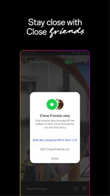 Предайте своята история по уникален начин с Instagram. Споделяйте бързи моменти чрез Stories и Notes, които изчезват след 24 часа, поддържайки разговорите динамични и актуални. За по-интимни обсъждания, започвайте групови чатове и споделяйте неподправени моменти с вашия кръг от близки приятели. Увековечете спомени от скорошни събития или пътешествия във вашия Feed или превърнете живота си във филм с Reels – кратки, забавни видеоклипове, които преобразяват вашето съдържание. Персонализирайте всяка публика с ексклузивни шаблони, музика, стикери и филтри, придавайки й личен почерк.