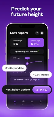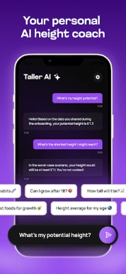 С Taller пътят към по-висок ръст започва с персонализирано разбиране. Отговаряйки на внимателно подбрани въпроси относно вашия начин на живот, вие създавате основата за изцяло индивидуален план. Taller не само предвижда каква може да бъде вашата бъдеща височина, но и генерира конкретни препоръки, насочени към потенциално стимулиране производството на човешки хормон на растежа. Освен това, приложението предлага динамични месечни актуализации на прогнозата за вашия ръст, като непрекъснато отразява напредъка ви и интегрира нова информация. Така винаги сте информирани за еволюцията на вашия потенциал.