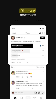 Откривайте безкрайни източници на вдъхновение – от препоръки за филми до съвети за кариера, намерете отговори на въпросите си или научете нещо ново от колективната мъдрост на общността, лидери на мнения и експерти. Никога не пропускайте важен момент; бъдете в крак с най-новите тенденции и събития на живо – било то нова музика, филмови премиери, спорт, игри или последните продуктови и модни новости. Получавайте известия, когато любимите ви профили започнат нова нишка. Threads е също част от федъвърса – глобална, отворена социална мрежа от независими сървъри, позволяващи споделяне на информация и откриване на нови хоризонти в цялата тази разширена мрежа.